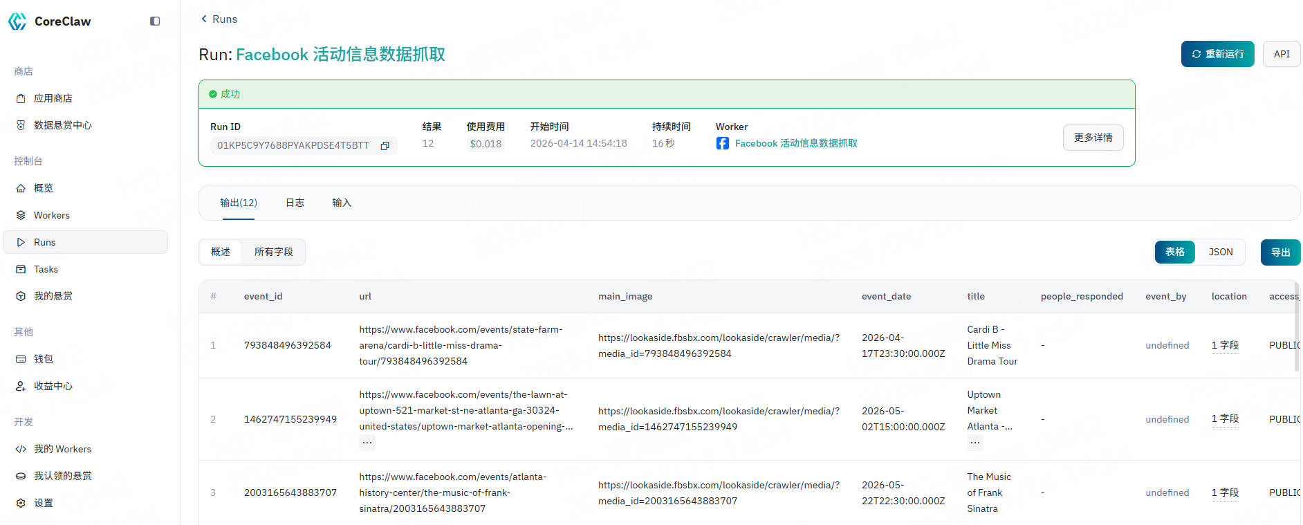 CoreClaw Facebook 活动信息数据抓取在后台为您处理代理轮换、任务调度、数据标准化和最终交付。只需几分钟,您就可以通过以下步骤获取数据: