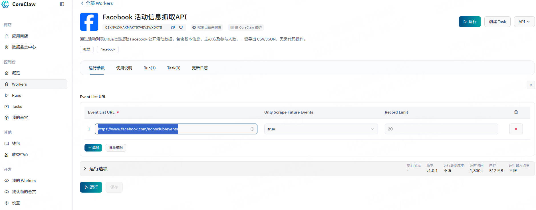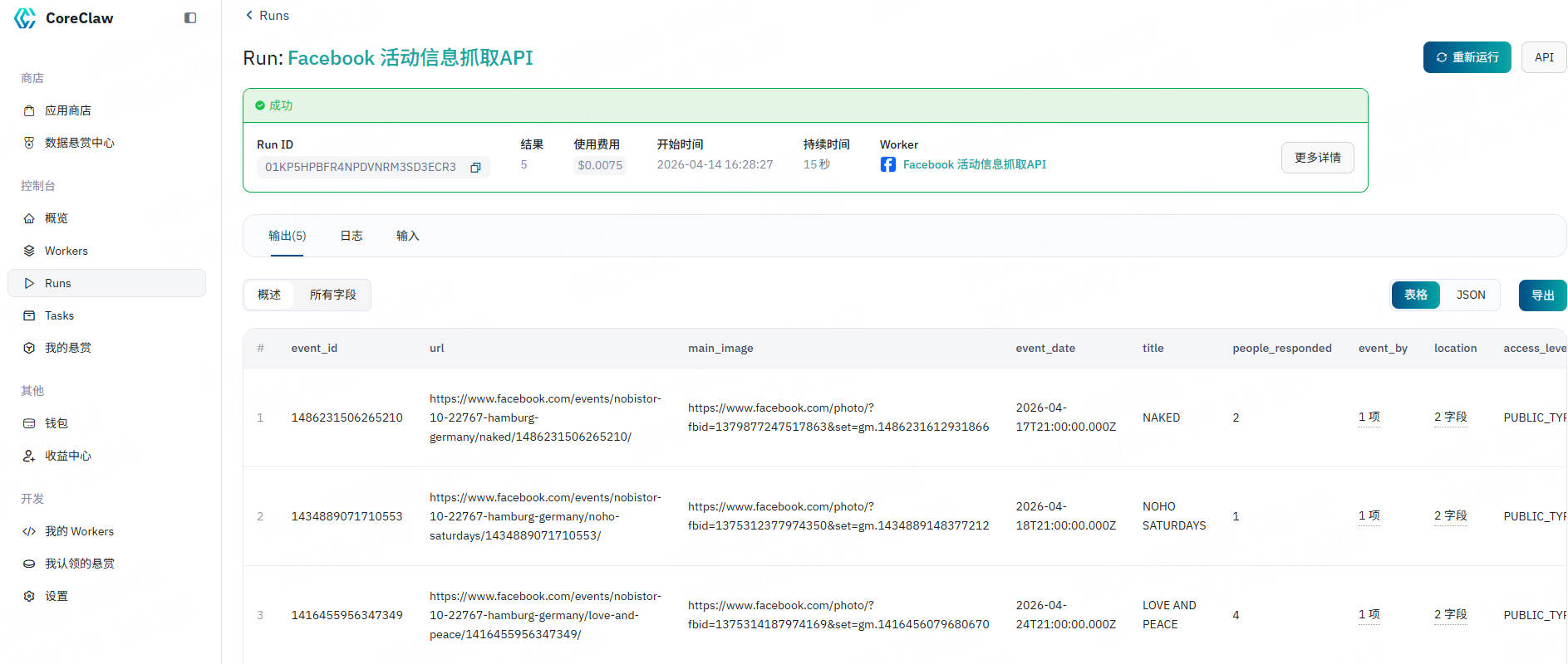 CoreClaw Facebook 活动信息抓取API在后台为您处理代理轮换、任务调度、数据标准化和最终交付。只需几分钟,您就可以通过以下步骤获取数据: