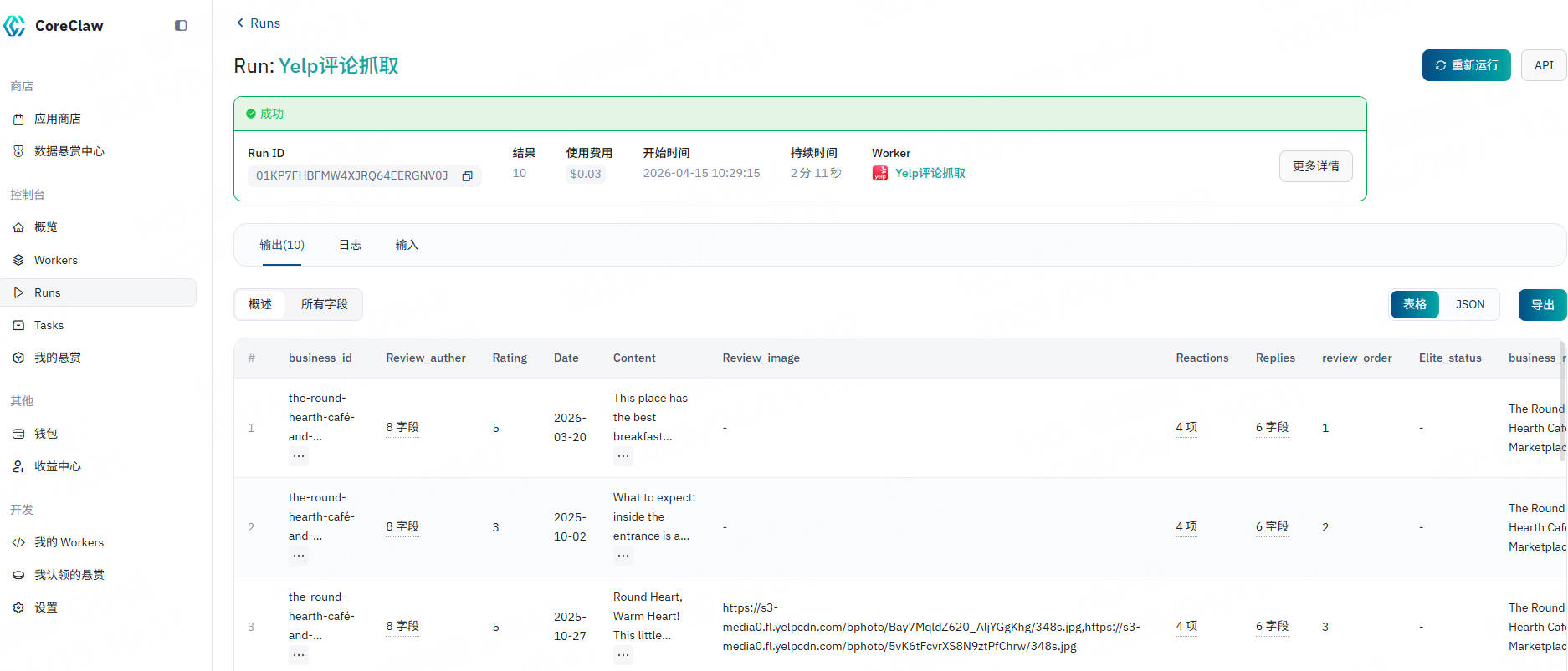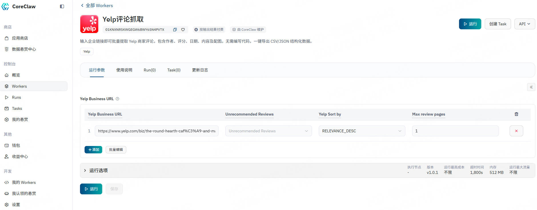 CoreClaw Yelp评论抓取在后台为您处理代理轮换、任务调度、数据标准化和最终交付。只需几分钟,您就可以通过以下步骤获取数据: