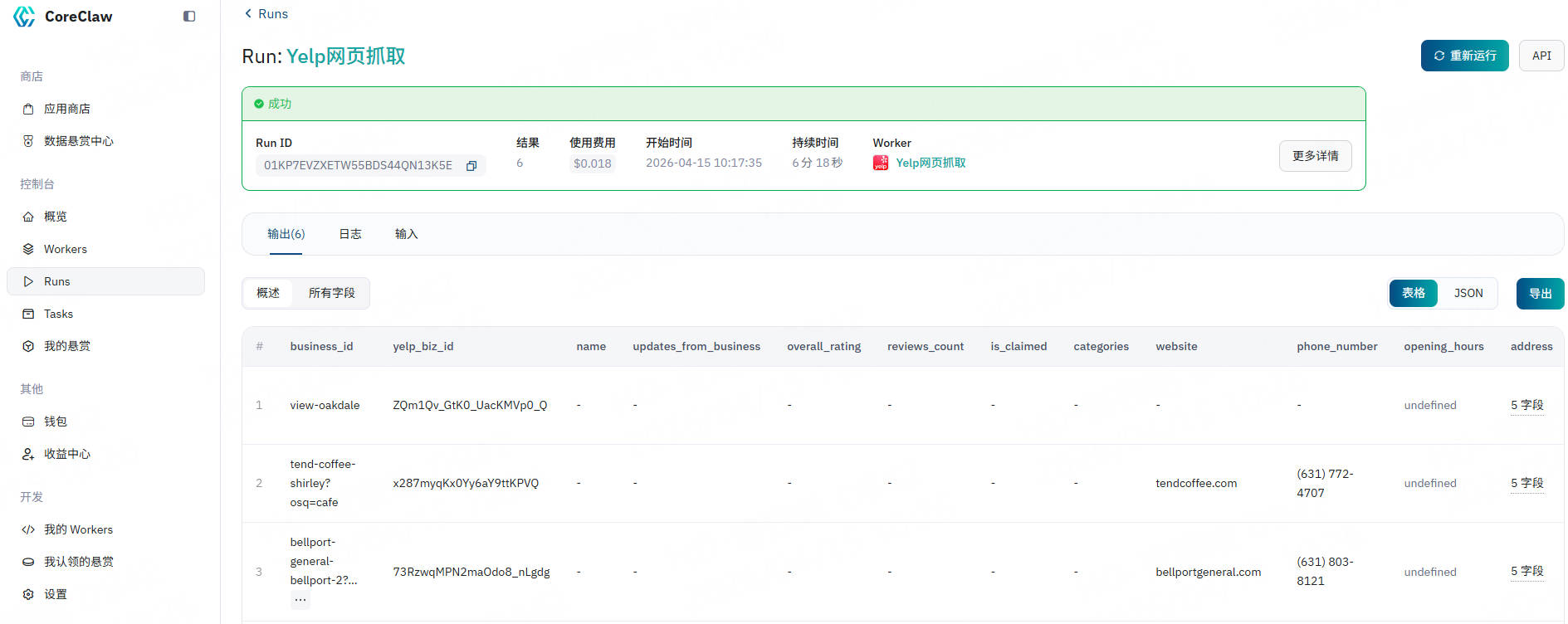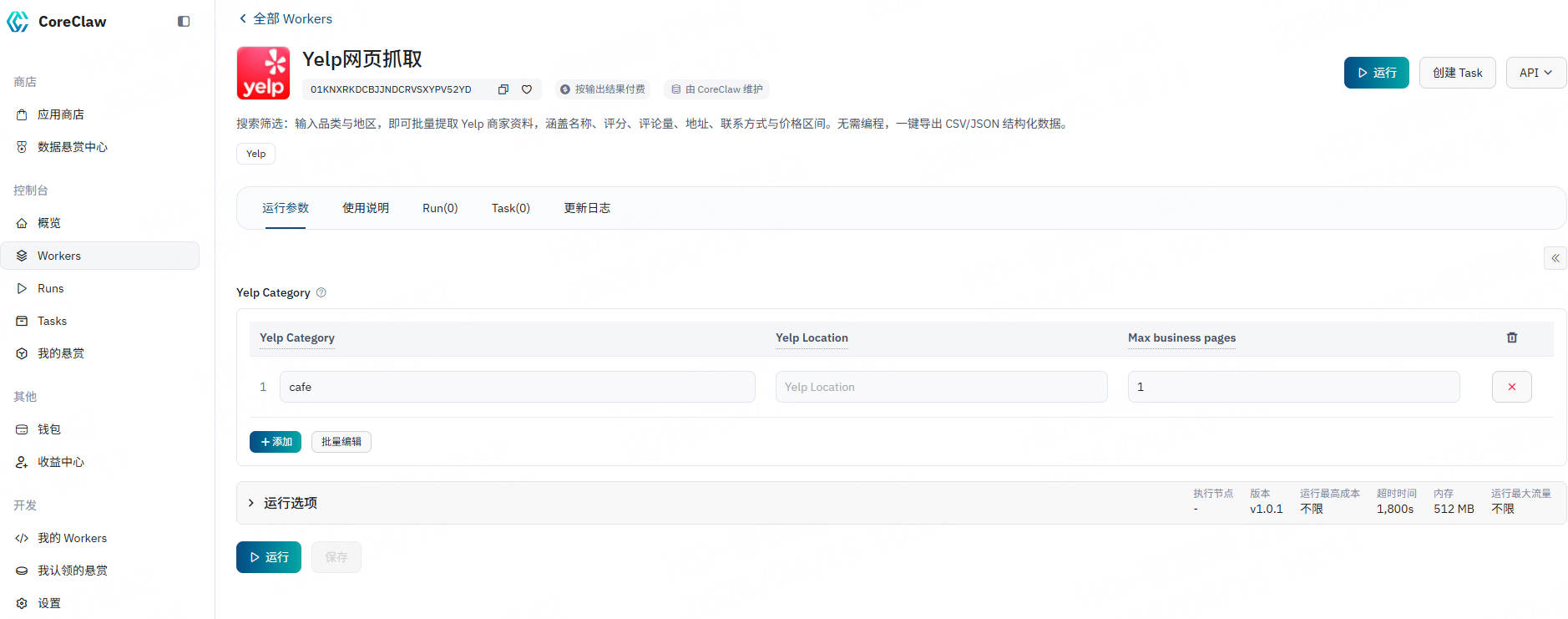 CoreClaw Yelp网页抓取在后台为您处理代理轮换、任务调度、数据标准化和最终交付。只需几分钟,您就可以通过以下步骤获取数据: