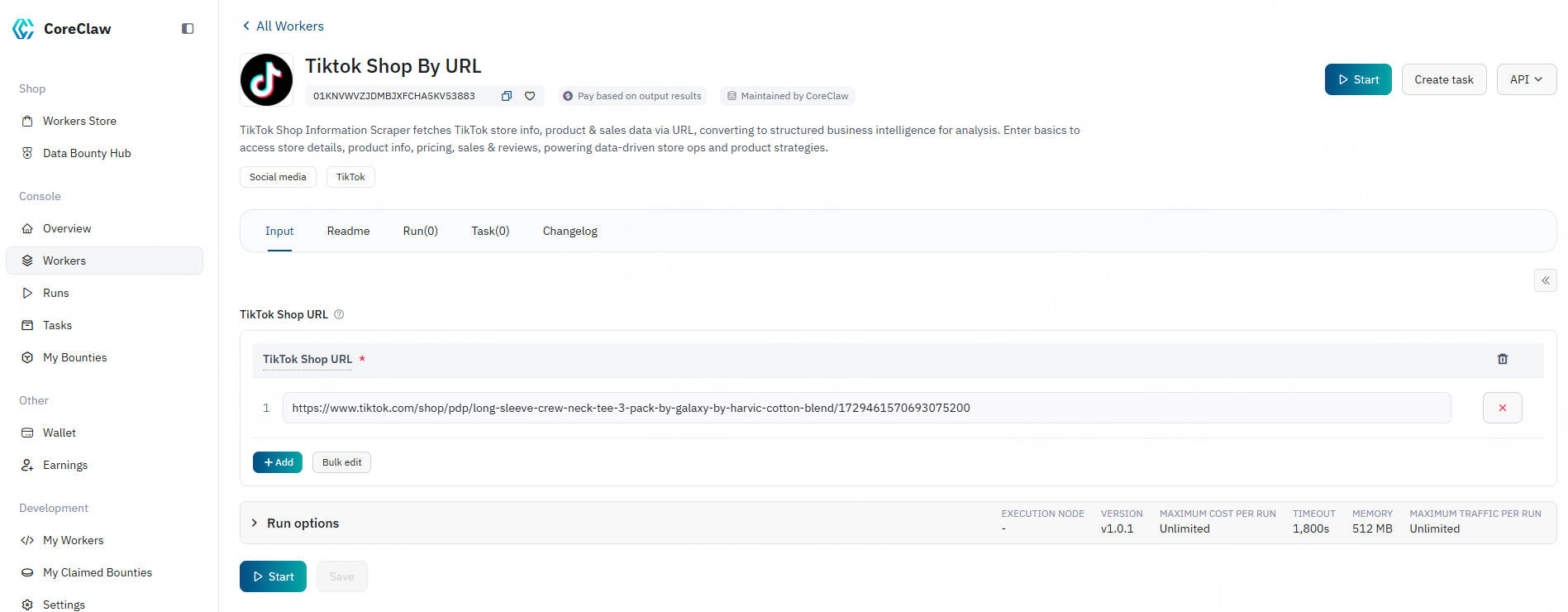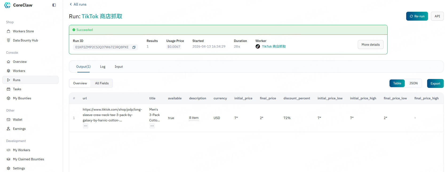 CoreClaw TikTok Shop Scraper handles proxy rotation, task scheduling, data standardization, and final delivery in the background for you. In just a few minutes, you can get data through the following steps:
