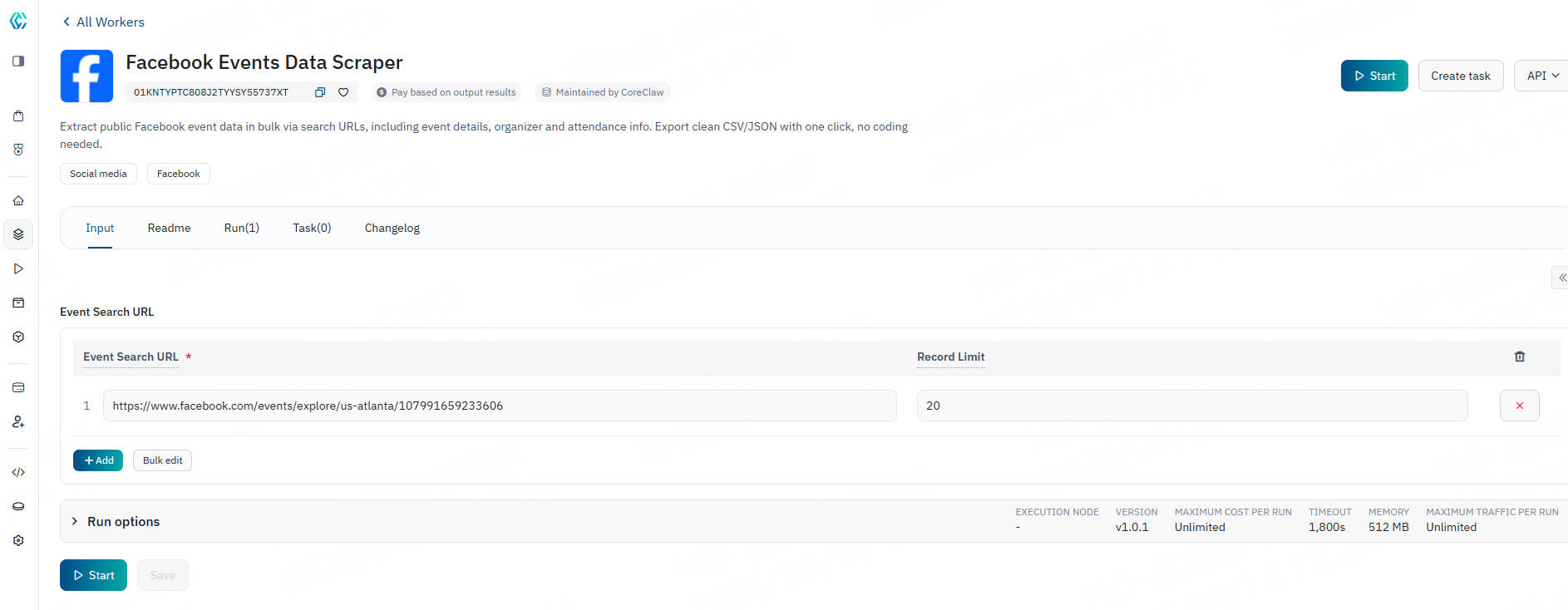 CoreClaw Facebook Events Data Scraper handles proxy rotation, task scheduling, data normalization, and final delivery for you in the background. In just a few minutes, you can obtain data through the following steps: