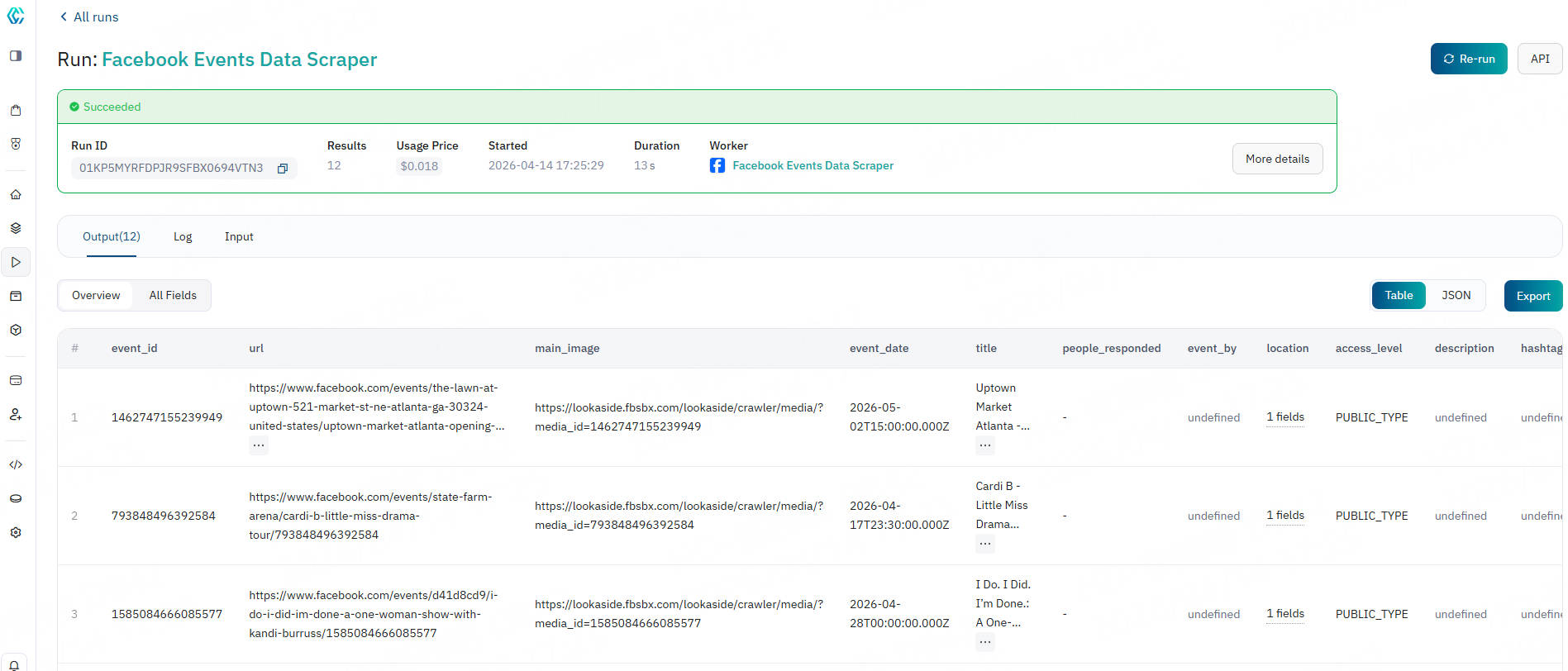 For your convenience, output results are displayed in tables and tabs. You can choose to download results in CSV/JSON format. Here is an example of event information data scraped using search terms: