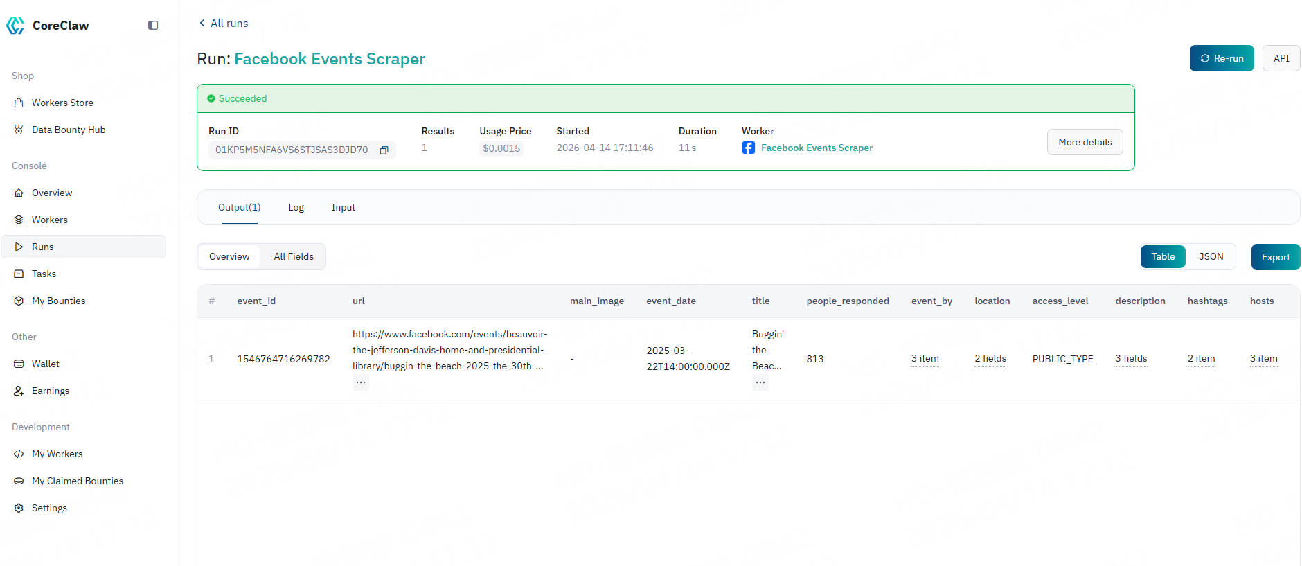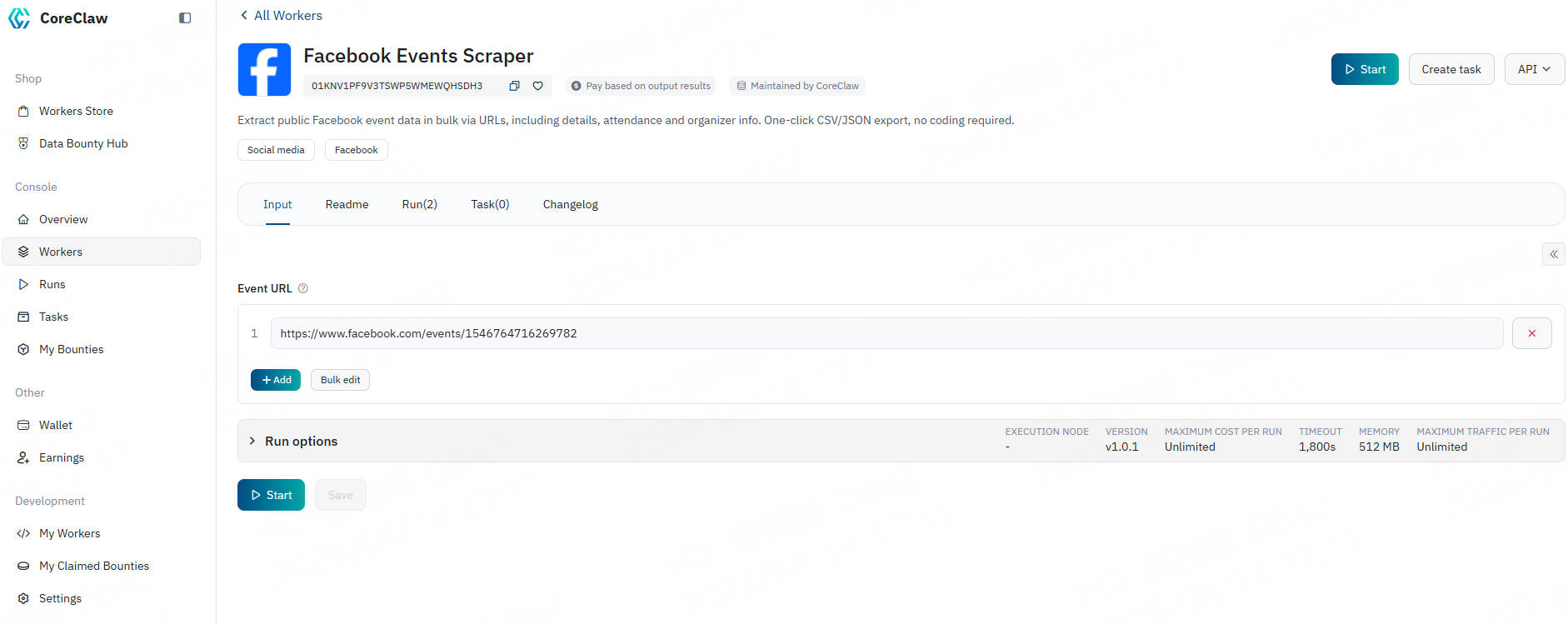 CoreClaw Facebook Events Scraper handles proxy rotation, task scheduling, data normalization, and final delivery for you in the background. In just a few minutes, you can obtain data through the following steps: