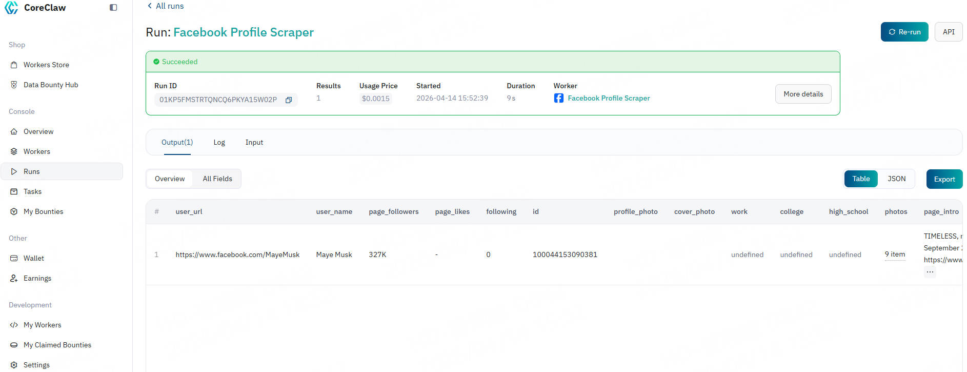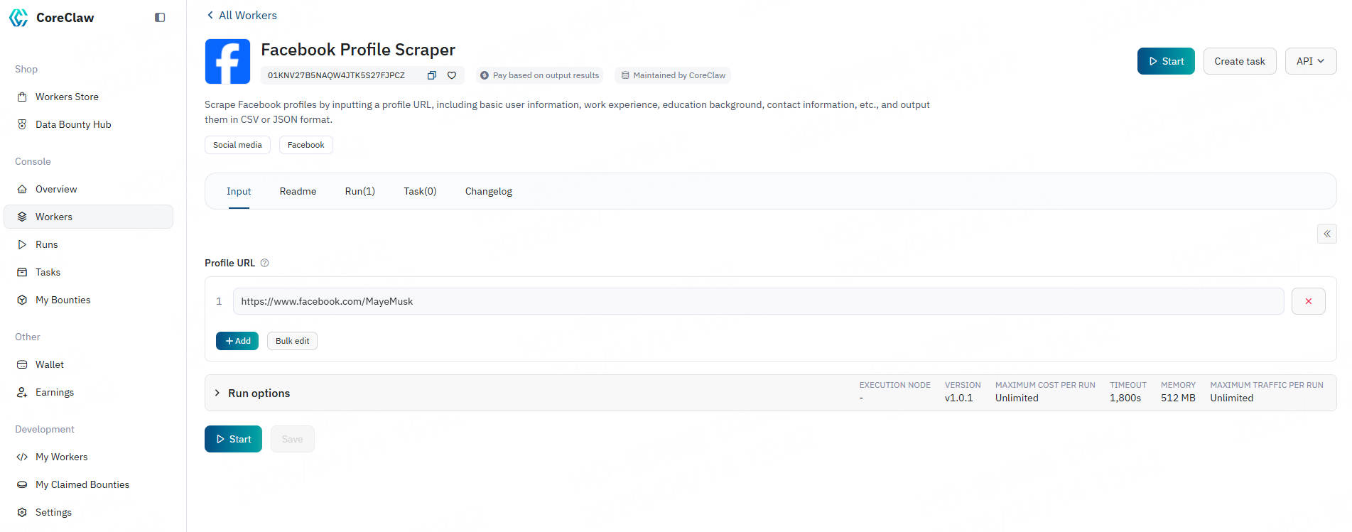 CoreClaw Facebook Profile Scraper handles proxy rotation, task scheduling, data normalization, and final delivery for you in the background. In just a few minutes, you can obtain data through the following steps: