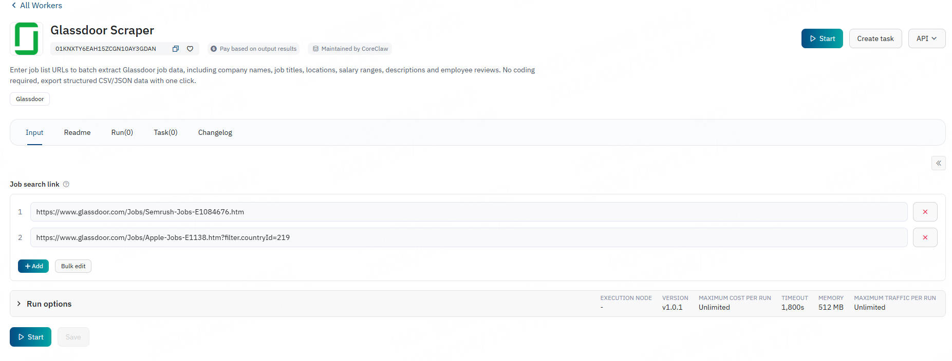 CoreClaw Glassdoor Scraper handles proxy rotation, task scheduling, data standardization and final delivery in the background for you. In just a few minutes, you can get data through the following steps: