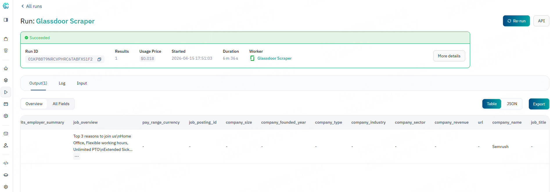 The tool returns the latest available information on the Glassdoor platform at the time of task execution. Our tool responds quickly, ensuring you get the latest relevant data.