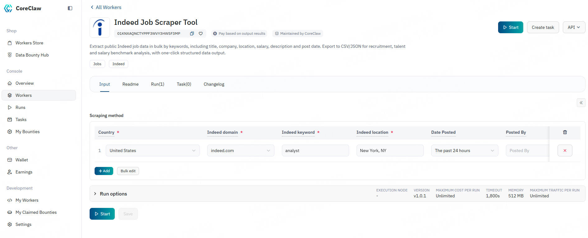CoreClaw Indeed Job Scraper Tool handles proxy rotation, task scheduling, data normalization, and final delivery for you in the background. In just a few minutes, you can obtain data through the following steps: