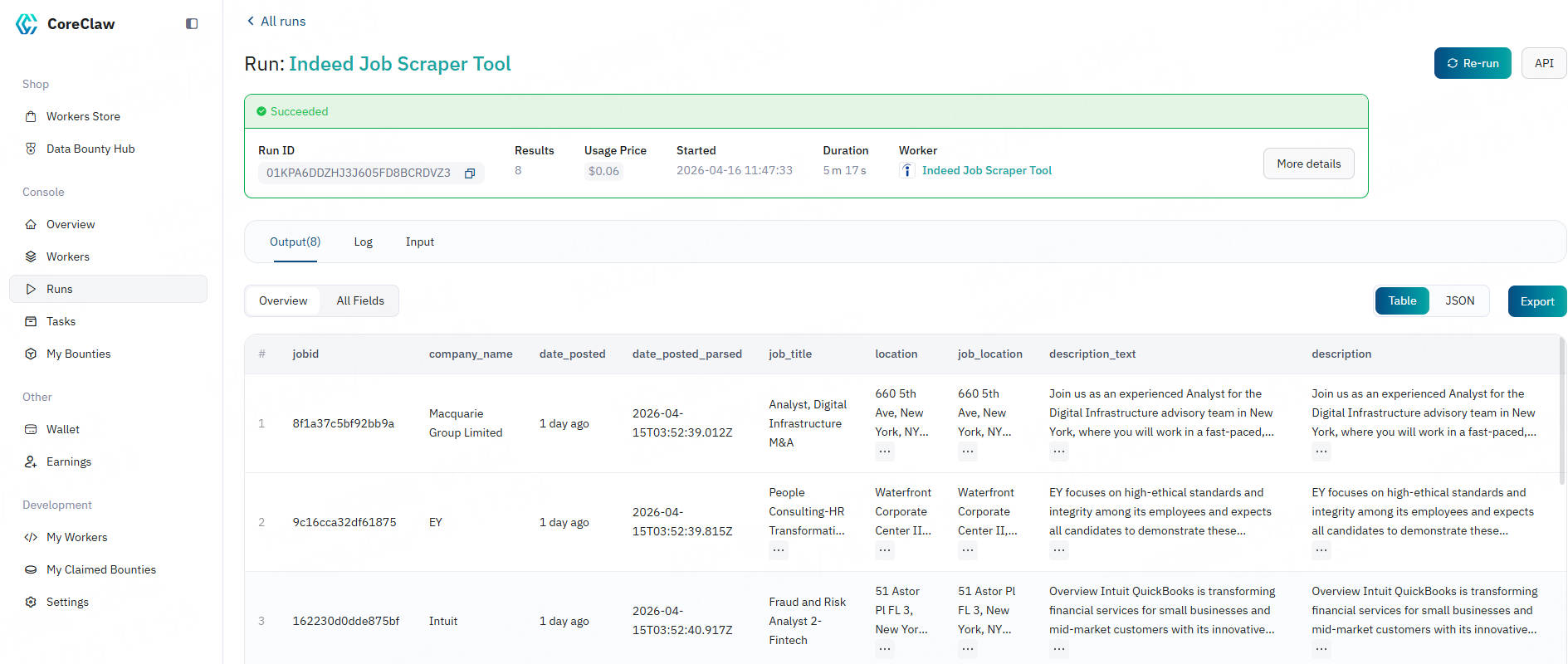 For your convenience, output results are displayed in tables and tabs. You can choose to download results in CSV/JSON format. Here is an example of job information data scraped using keywords: