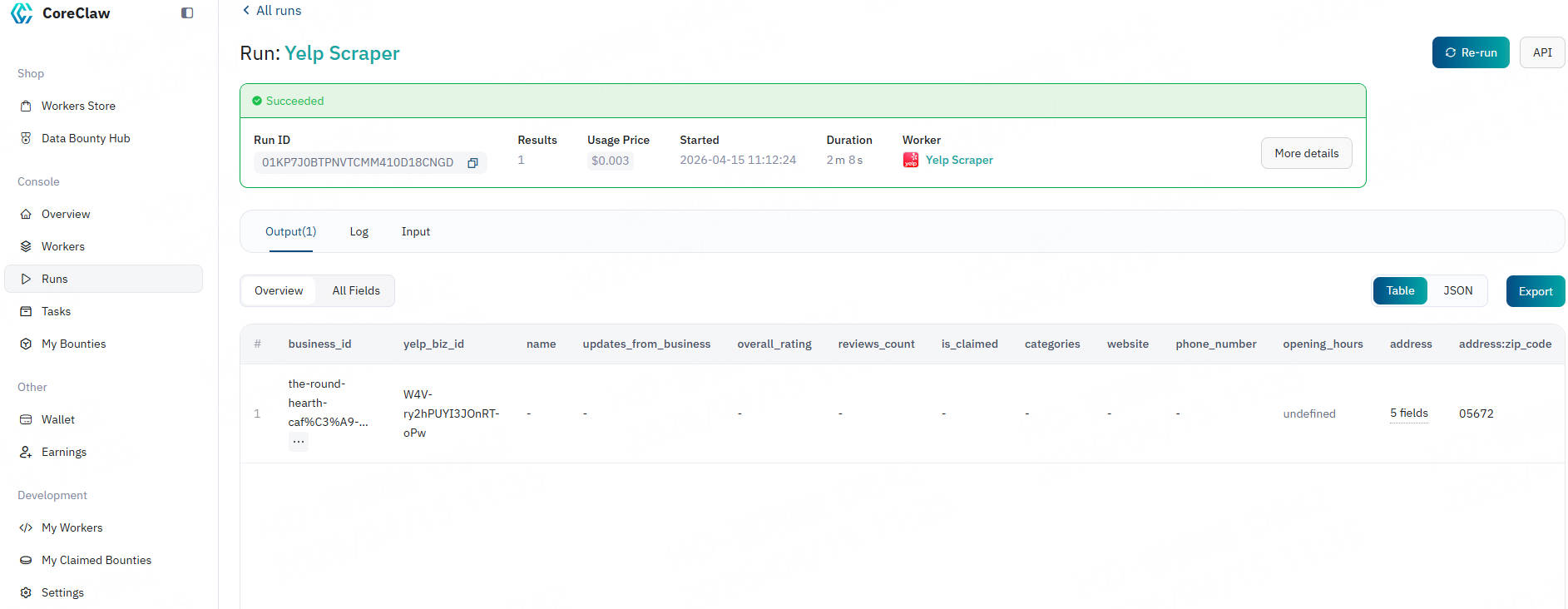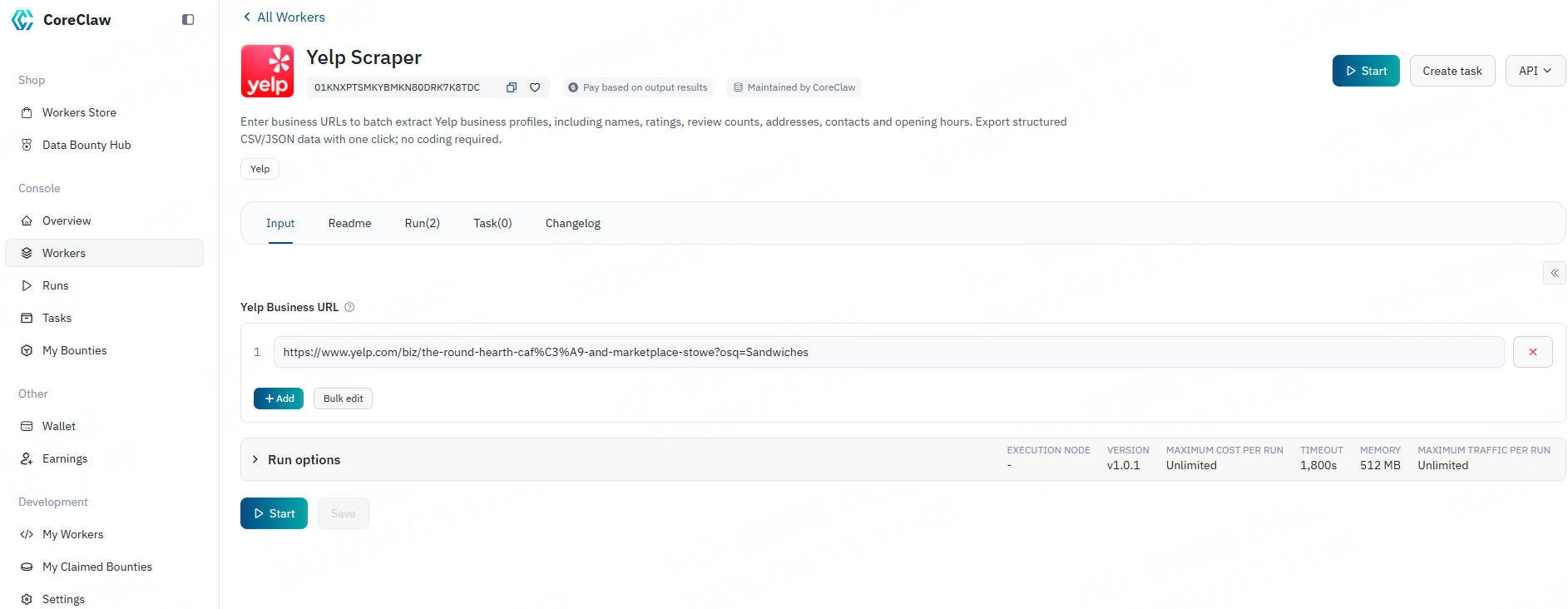CoreClaw Yelp Scraper handles proxy rotation, task scheduling, data standardization and final delivery in the background for you. In just a few minutes, you can get data through the following steps: