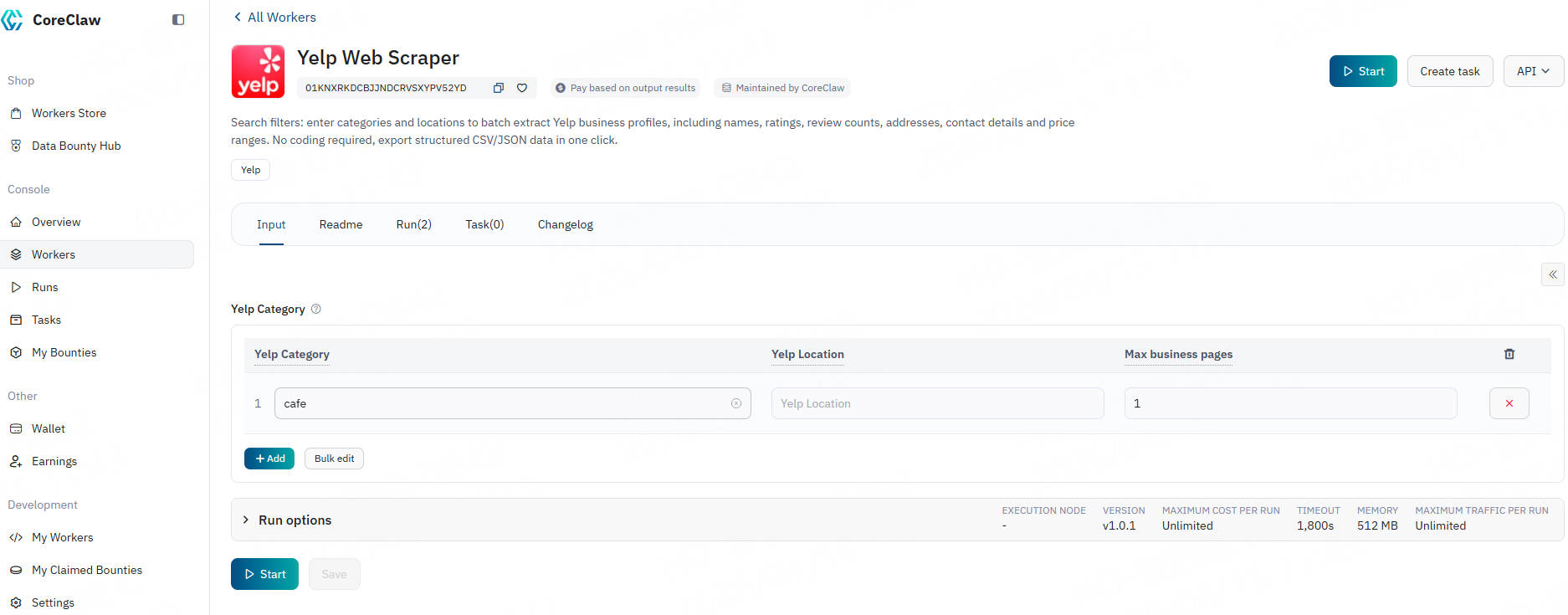 CoreClaw Yelp Web Scraper handles proxy rotation, task scheduling, data standardization and final delivery in the background for you. In just a few minutes, you can get data through the following steps: