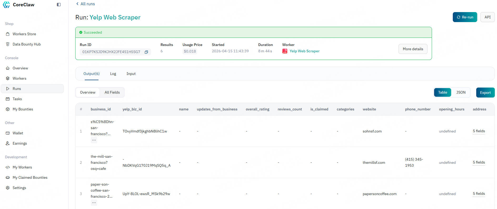 Yelp Web Scraper is an automated data extraction tool specifically designed to batch collect business name, rating, review count, address, contact information, business hours, price range and other data from public Yelp platform via category and location filtering. Using CoreClaw, you can obtain structured data without code, helping industry analysis, market research and business intelligence collection.