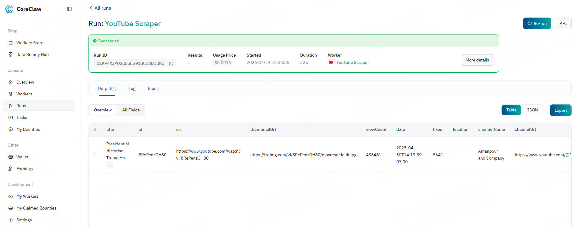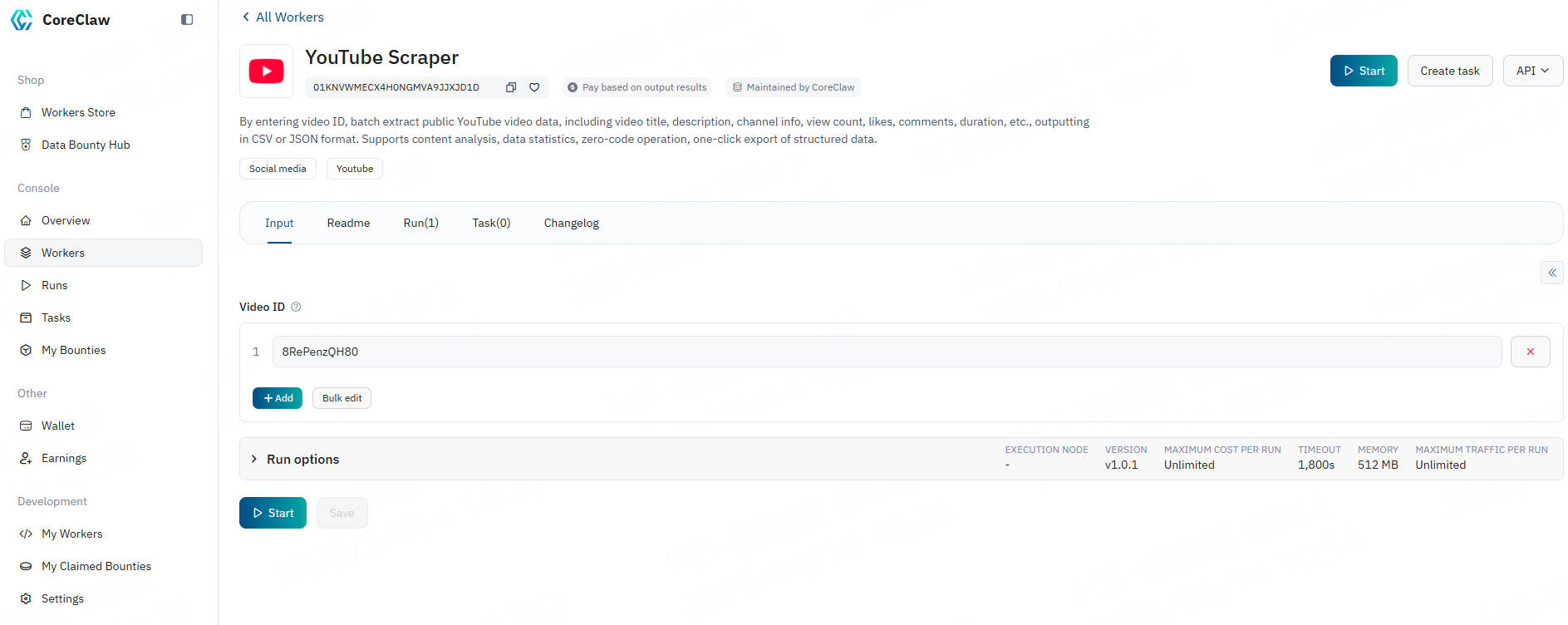 CoreClaw YouTube Scraper handles proxy rotation, task scheduling, data standardization, and final delivery for you in the background. In just a few minutes, you can obtain data through the following steps: