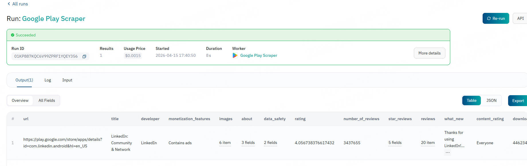 For easy viewing, output results are displayed in table and tab formats. You can choose to download results in CSV/JSON format. Below is an example of app information data scraped using URLs: