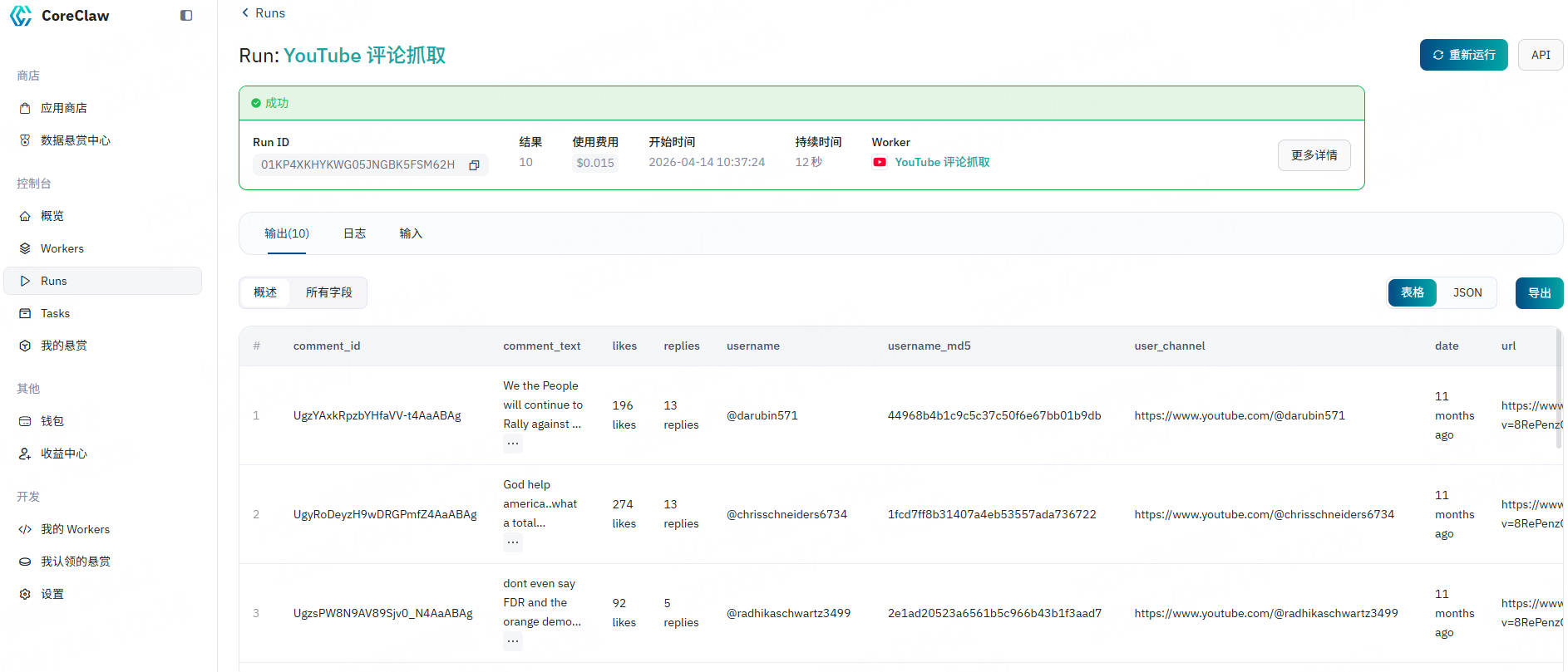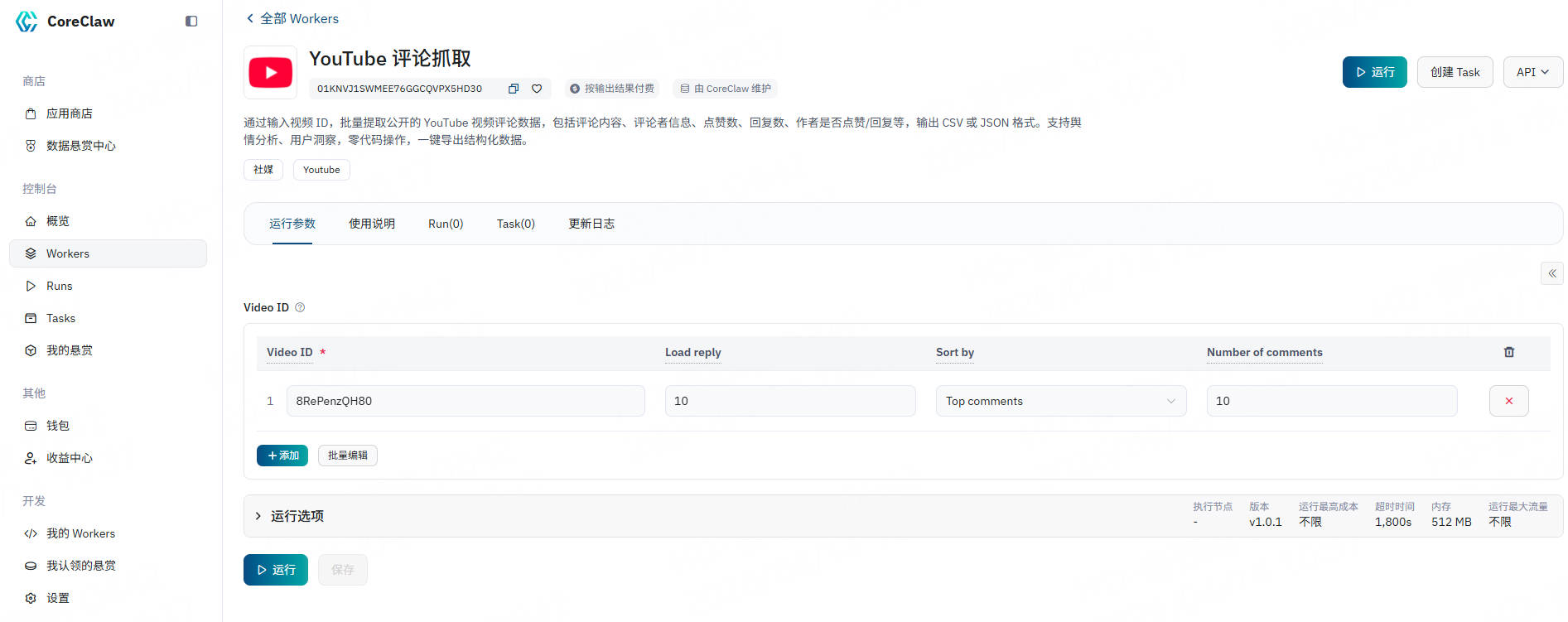 CoreClaw YouTube 评论抓取在后台为您处理代理轮换、任务调度、数据标准化和最终交付。只需几分钟,您就可以通过以下步骤获取数据: